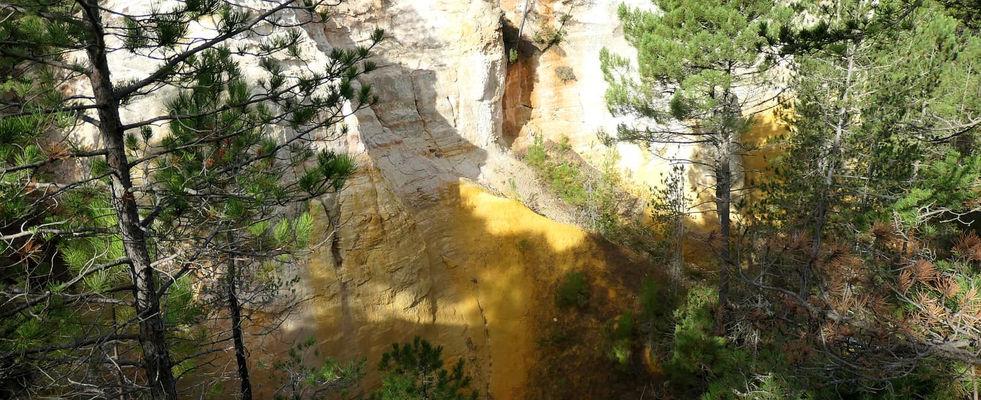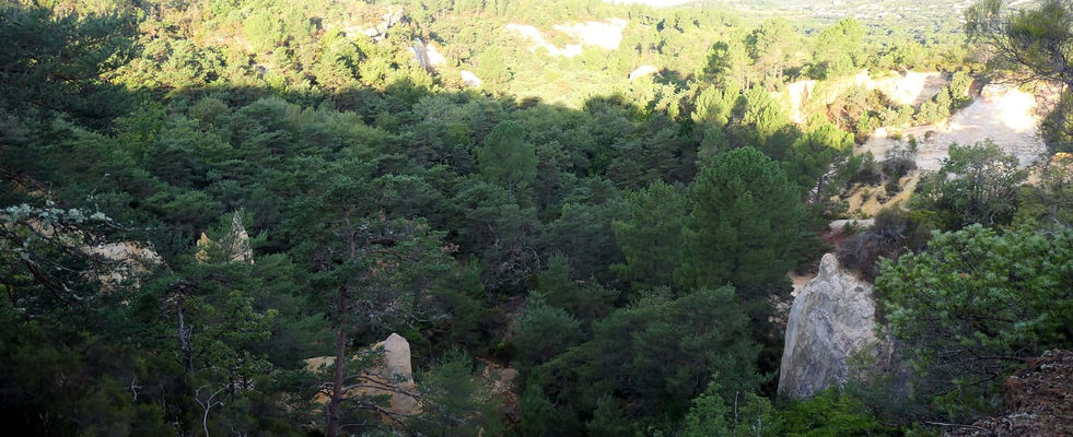 Je continue à longer le Colorado Provençal, sans descendre dans le ravin de la Fedo Morto : c’est un sentier non balisé, parfois escarpé, et surtout, glissant. Je verrai donc les carrières d’ocre depuis le sentier du GRP Lubéron - Monts du Vaucluse.
