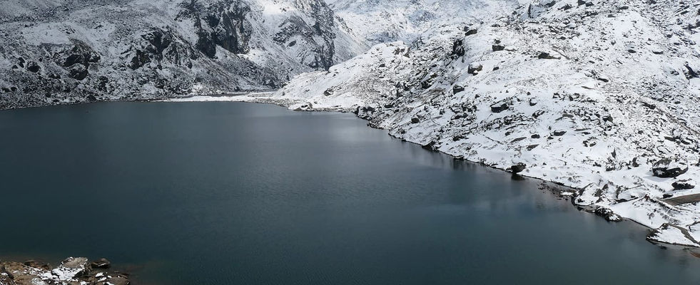 Après un thé citron encore chaud dans la thermos, nous descendons vers Gosaikund. Les quelques lacs, sous la neige, dans cette atmosphère nuageuse, sont à peine décelables.