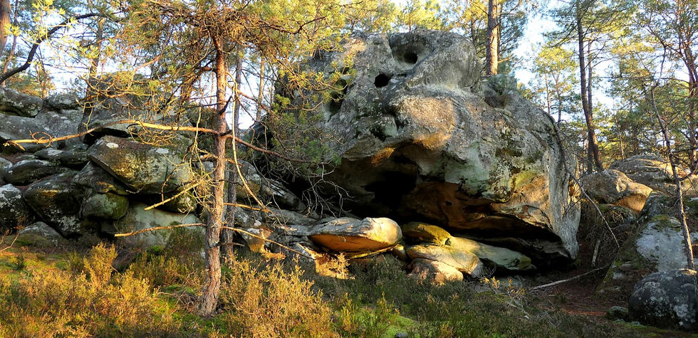 Les rochers se succèdent, illuminés par un soleil radieux, la Grotte du Curé au petit matin, le rocher St Etienne, le Maunoury, le rocher de Dame Jouanne, le Mont Simonet, jusqu'à une carrière ensablée.
