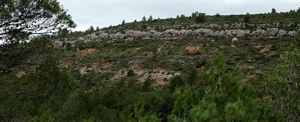 J’avance entourée de la terre rouge ocre typique des Corbières (riche en fer) et j’arrive, par un sentier découverte (hors GR) aux soulèvements géosynclinaux le long de la faille de Villerouge-Albas (inclinaisons de 40-45° typiques de ces mouvements tectoniques liés à l'accrochage de la plaque ibérique au début du tertiaire. Il aurait même été trouvé des œufs de dinosaure dans cette région).