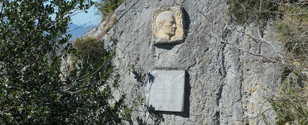 Juste avant l'arrivée devant l’enceinte du château, est posée une plaque en hommage à l'écrivain et poète Maurice Magre, qui a contribué, au début du XXème siècle, à faire connaître la martyre des cathares du XIIIème siècle.