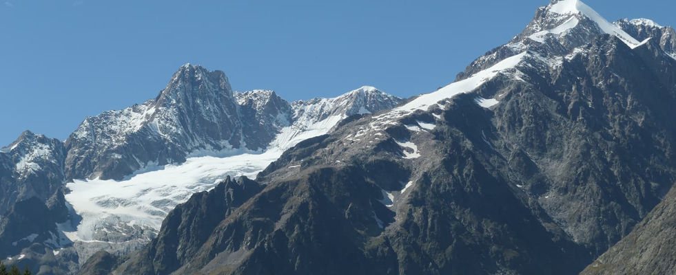 En amont de Courmayeur sont visibles le mont Blanc, le mont Maudit, le mont Blanc du Tacul, le Grand Flambeau, la pointe Helbronner, les glaciers de la Brenva, Toula et Rochefort.