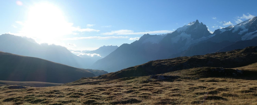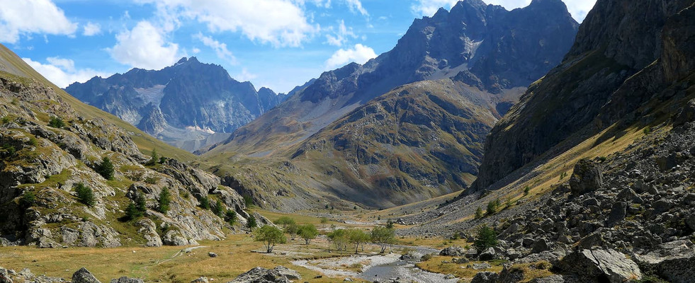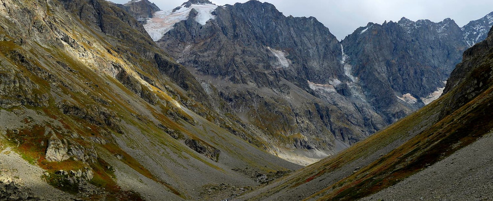 En progressant, on aperçoit la vallée vers la source de la Romanche et le refuge Adèle Planchard, ainsi que le glacier de la Plate des Agneaux.