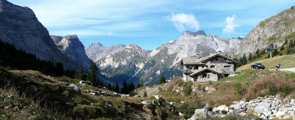 Les glaciers de la Vanoise restent visibles à l'horizon, au sud ouest, en arrière plan du refuge qui fait face, au sud est, aux pointes de la Sana et du Charbonnier.