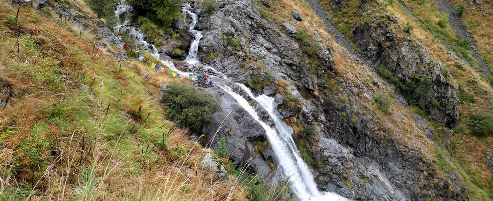 Je retrouve la cascade de la Pisse, qui a gagné en débit. La neige a blanchi les sommets derrière le refuge, et le Vieux Chaillol apparaît dans les nuages, ses pentes saupoudrées de neige: